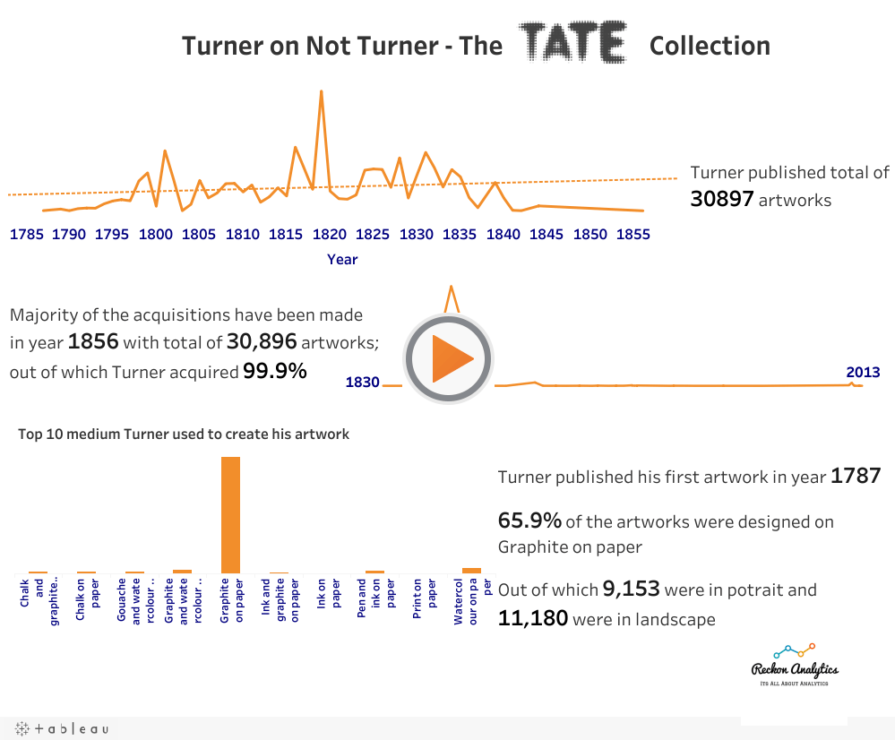 This visualisation is based on the dataset provided by Makeover Monday for week 24. The Tate collection dataset contains the records of all the artists and artworks in the collection. The overview of the distribution of the collection over years has been of uttermost importance. A large amount of data represents artworks designed by Joseph Mallord William Turner. Therefore, the visualisation is named Turner or not Turner and extractions has been accordingly.